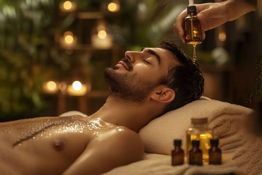 The oils used for Ayurvedic Abhyanga Massage may contain sesame, coconut, sunflower, mustard, and almond. In contrast, in specific cases, medicated oils infused with Ayurvedic herbs are utilised to address health conditions. It imparts deeper healing effects that naturally harmonise mind, body, and soul.